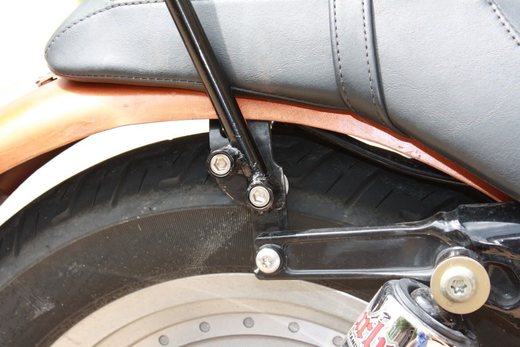 Who says you can't have a fucking outrageous sissy bar with a swingarm. I fabricated this one out of 5/8 rod. I relocated the fender strut after I chopped off the ugly fucking struts. Bought some bungs from BungKing. com and went to town.